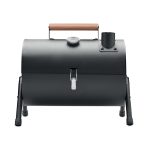 Grătar portabil din fier cu coș de fum și indicator de temperatură. Focar negru. Zăvor de blocare și mâner de transport din lemn.