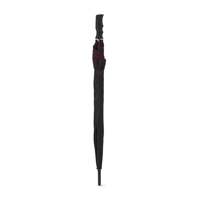 Umbrelă cu deschidere automată, 23 inchi, din poliester satinat 190T, ax cu fibră de sticlă, spițe colorate și terminații negre din plastic. Panele negre cu cusături asortate. Mâner drept negru, din plastic. Închidere manuală.